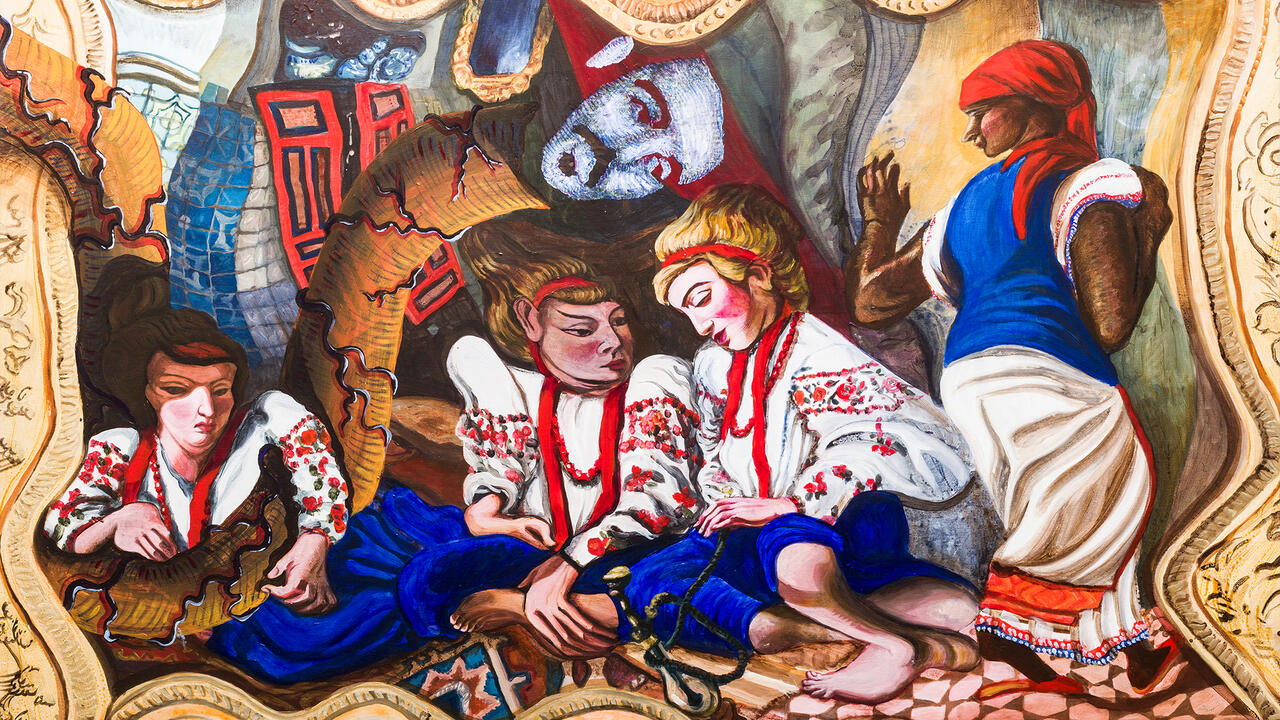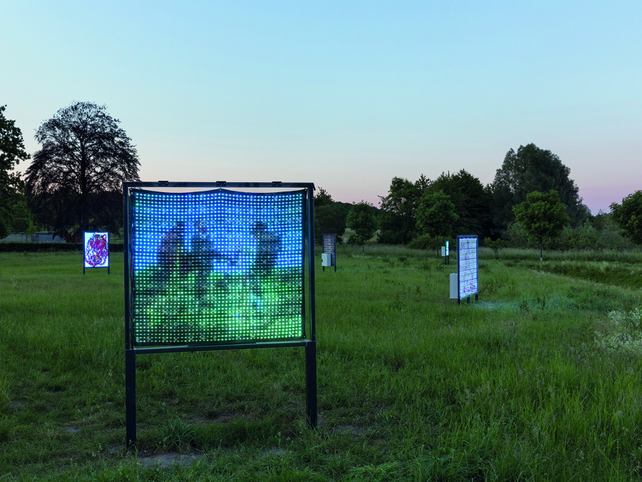 Ei Arakawa’s Harsh Citation, Harsh Pastoral, Harsh Münster engages with its location in a clearer way. Seven LED screens occupy a large field near Lake Aasee and turn better- and lesser-known paintings into seemingly free-standing advertisements. Each screen shows a digital copy of a painting by the artist’s friends, former teachers or artistic influences, from Gustave Courbet to Jutta Koether, Joan Mitchell, Amy Sillman and Reena Spaulings. Courbet’s La Rencontre (The Meeting, 1854) sets the tone, depicting an artist strolling through a field. Each screen plays a soundtrack, singing an interpretive song that tells the visitor what it is ‘about’. In this pastoral setting, Arakawa critiques both the normative presentation of paintings as static objects while toying with the discursive embellishment of ‘painting’ as performance.