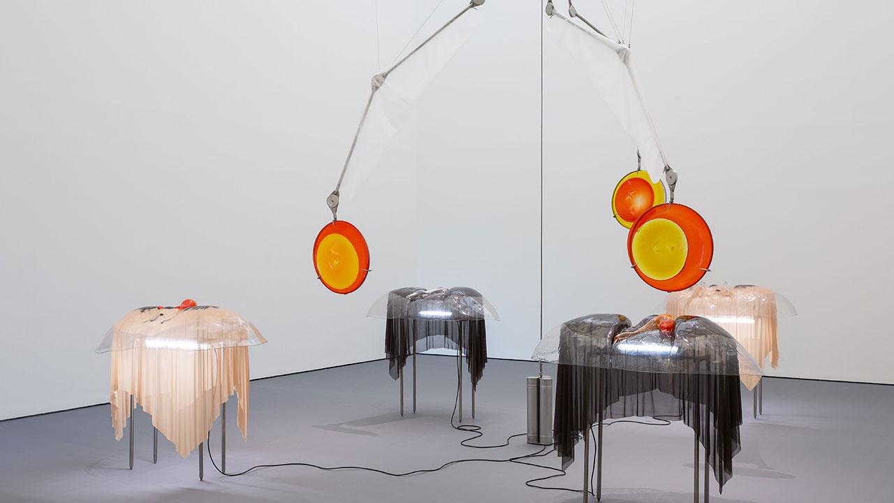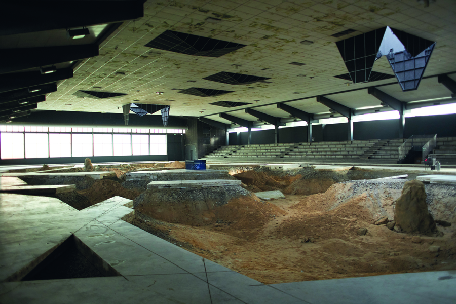 Conceptually overloaded but visually arresting is Pierre Huyghe’s spectacular After ALife Ahead, which transforms a former ice skating rink that is about to be demolished into an almost moonlike landscape, exposing the various layers of earth beneath the building, from clay to sand and gravel, all inhabited by biological life such as algae, bacteria and beehives. The roof opens and closes as determined by an algorithm based on the growth of incubated cancer cells, their rate of reproduction in turn synched with the vitality of the space (the movement of bees, CO2 and bacteria levels). A symbiosis of architecture, biological phenomena and symbolic landscape, the intervention suggests location and dislocation at once.